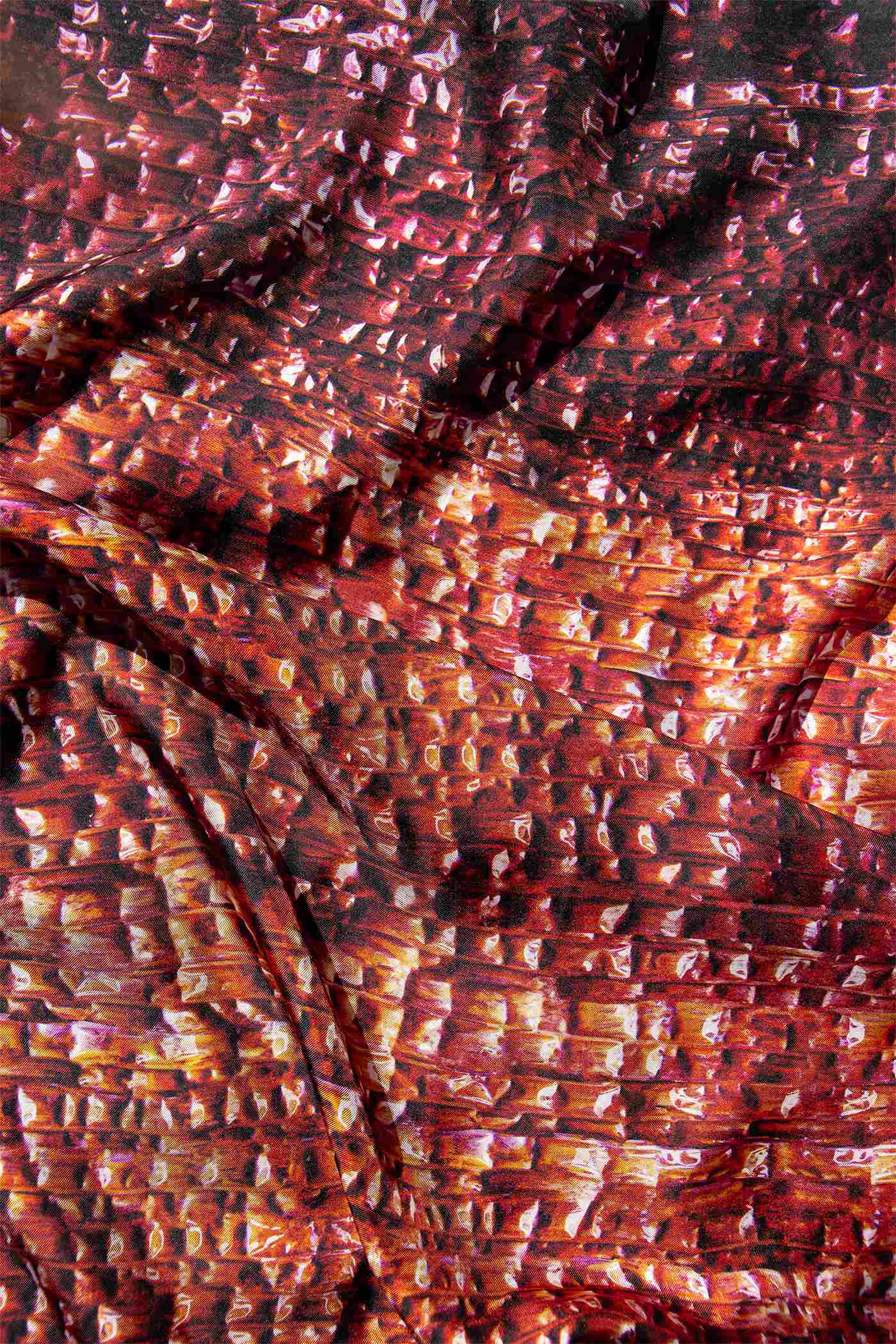 Bien plus qu’un accessoire, cette étole incarne l’alliance parfaite entre l’art et la mode, dévoilant le motif unique Brocot. Une texture créée à partir de plastique recyclé et transposée sur une toile originale par Amel Batita, artiste et designer de pièces d’exception en soie.