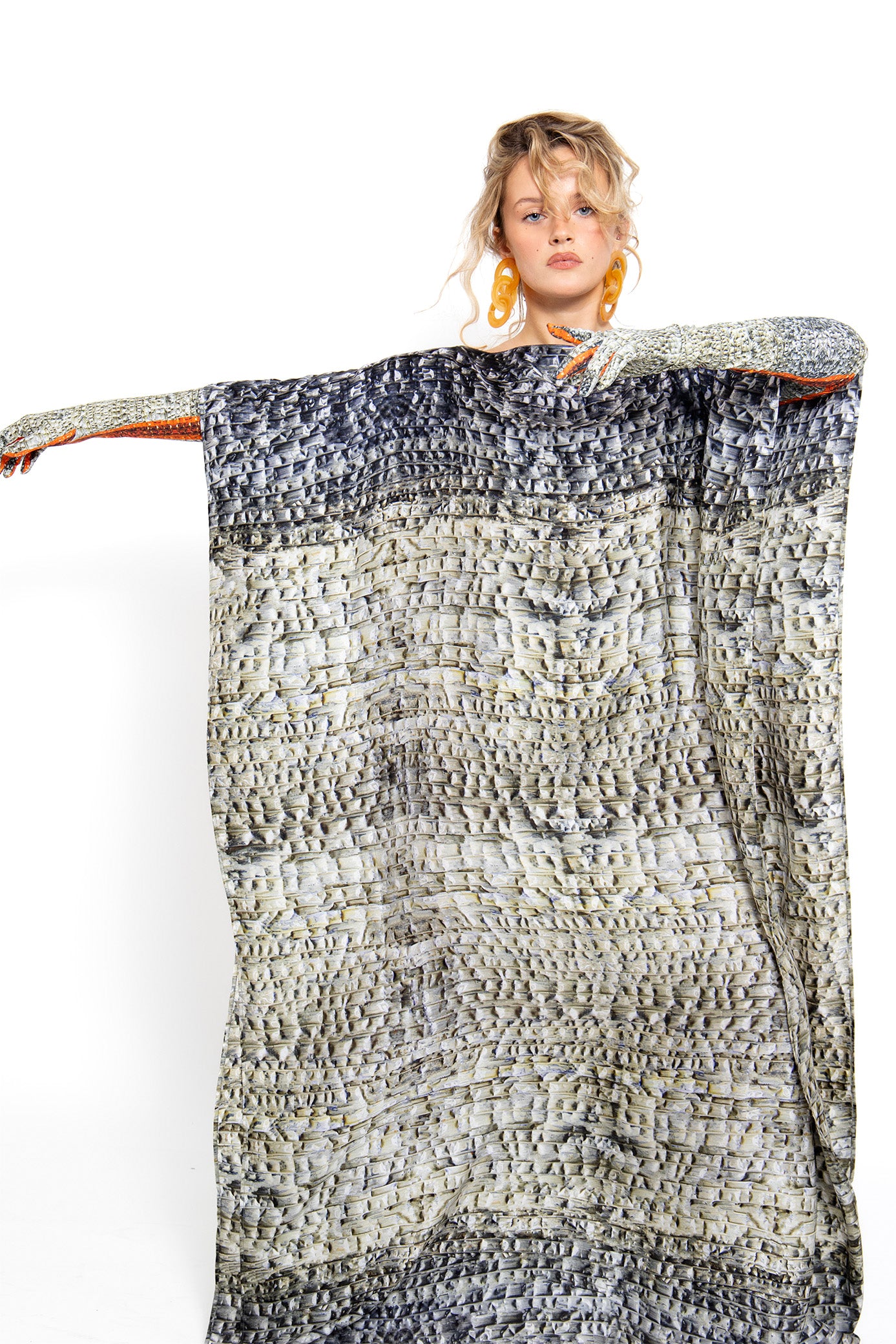 Son motif, né d’un processus unique impliquant plus de 1 000 bouteilles d’eau en plastique transformées sur une toile, illustre le savoir-faire propre à la marque Amel Batita : l’Artcycling. Il transpose les textures organiques de la collection Brocot dans une silhouette fluide et aérienne, comme une seconde peau dansante, révélant un équilibre parfait entre force et délicatesse.