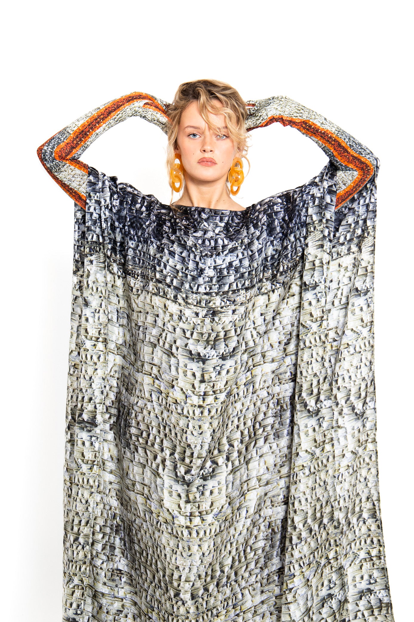 Prolongement des iconiques carrés de soie d’Amel Batita, ce caftan incarne la fusion entre art et mouvement, où le vêtement devient une toile en perpétuel dialogue avec la lumière et le vent.
